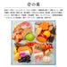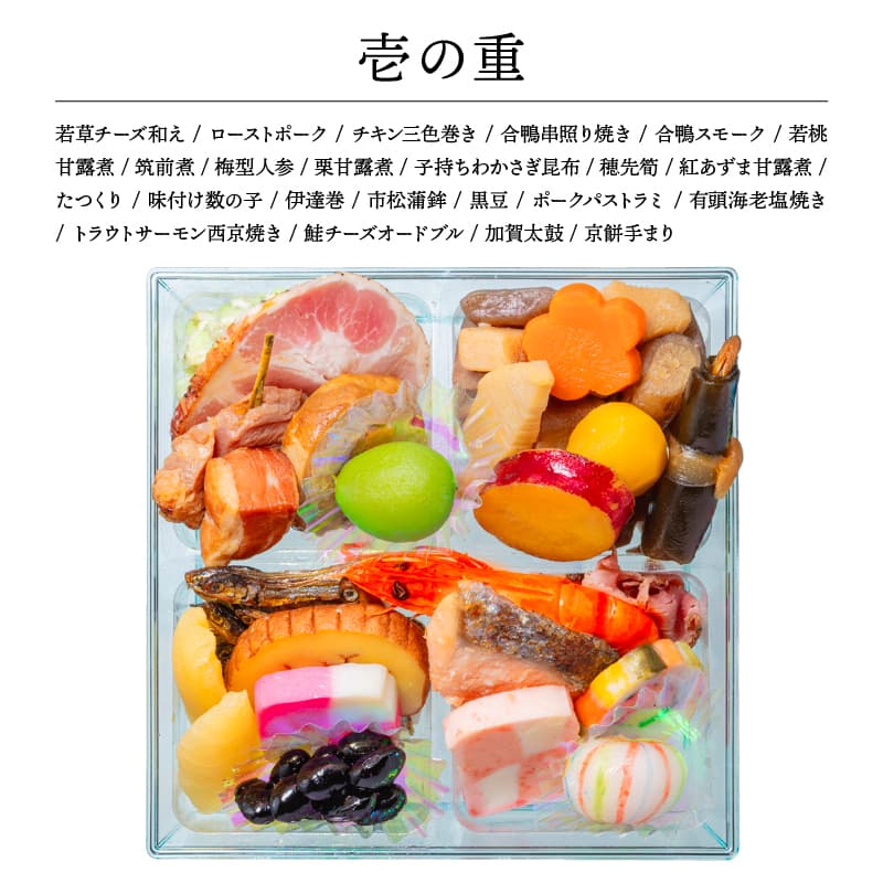 若草チーズ和え、ローストポーク、チキン三色巻き、合鴨串照り焼き、 合鴨スモーク、若桃甘露煮、筑前煮、梅型人参、栗甘露煮、 子持ちわかさぎ昆布、穂先筍、紅あずま甘露煮、たつくり、味付け数の子、 伊達巻、市松蒲鉾、黒豆、ポークパストラミ、有頭海老塩焼き、 トラウトサーモン西京焼き、鮭チーズオードブル、加賀太鼓、京餅手まり
